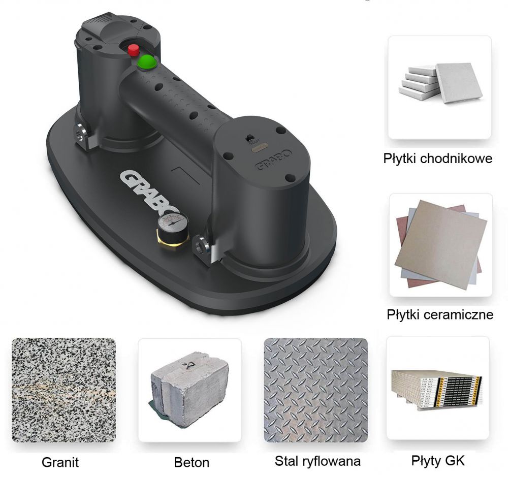 Il sollevatore a vuoto a batteria GRABO ha sostituito le ventose manuali precedentemente utilizzate ed è una ventosa versatile che può essere facilmente utilizzata per sollevare e trasportare materiali pesanti fino a 170 kg, come; vetro piano, piastrelle in ceramica, lastre in metallo, plastica, legno, cemento e cartongesso.